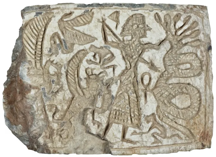 It has been proposed that he subsequently sinks underneath Yam’s throne and a third party, possibly Ashtart, affirms that he is losing, though the interpretation of this fragment is disputed.[88]However, Kothar-wa-Khasis reassures Baal and crafts two weapons for him, declaring that he will be able to defeat Yam.[89]They are presumed to be either maces or fictional lightning-like weapons, known from depictions of weather gods.[90]They both receive names, meant to designate them as capable of “expelling” and “driving away” Yam from his throne.[91]Baal first strikes him with Yagarrish (“may-it-drive-out”), but is unsuccessful, and only with the second strike, using Ayyamarri (“anyone-it-may-expel”), does he actually defeat him.[48]Yam collapses on the ground,[92]though the fight continues.[93]Baal might be “ensnaring” him.[94]A possible reference to “drying up” has also been identified.[95]In the following passage Ashtart according to most interpreters rebukes Baal, possibly because he did not act quickly or wisely enough in battle.[96]Alternate proposals include understanding her words as a warning not to further harm already defeated Yam, or a curse directed at the sea god.[48]The meaning of the term describing Baal’s actions in Ashtart’s speech, bṯ, is uncertain, though “scatter” has been proposed based on a possible Arabic cognate, baṯṯa, and on similar phrasing of the later section of the text dealing with Anat’s victory over Mot.